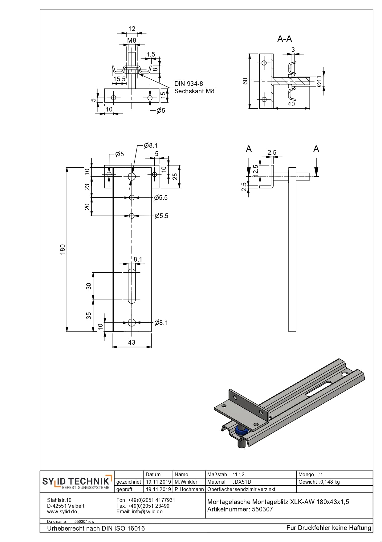 Diese Montageschiene ist PIV-geprüft und wird von uns für mittlere Belastungen empfohlen. Genaue Angaben zur Belastung entnehmen Sie bitte den Datenblättern. Lieferumfang: Montagelasche, Anschraubwinkel 60x25x15x1,5 mm mit angeschweißtem Gewindestift, Mutter M8